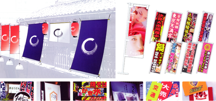 店舗がその場で宣伝活動を展開するのに最も安価で効果的なPR手段がのぼり旗です。 たった1枚の布がデザインを施される事で抜群の存在感を伴ったアピールツールへと様変わりします1色刷りからフルカラー(写真)等までおまかせ下さい。