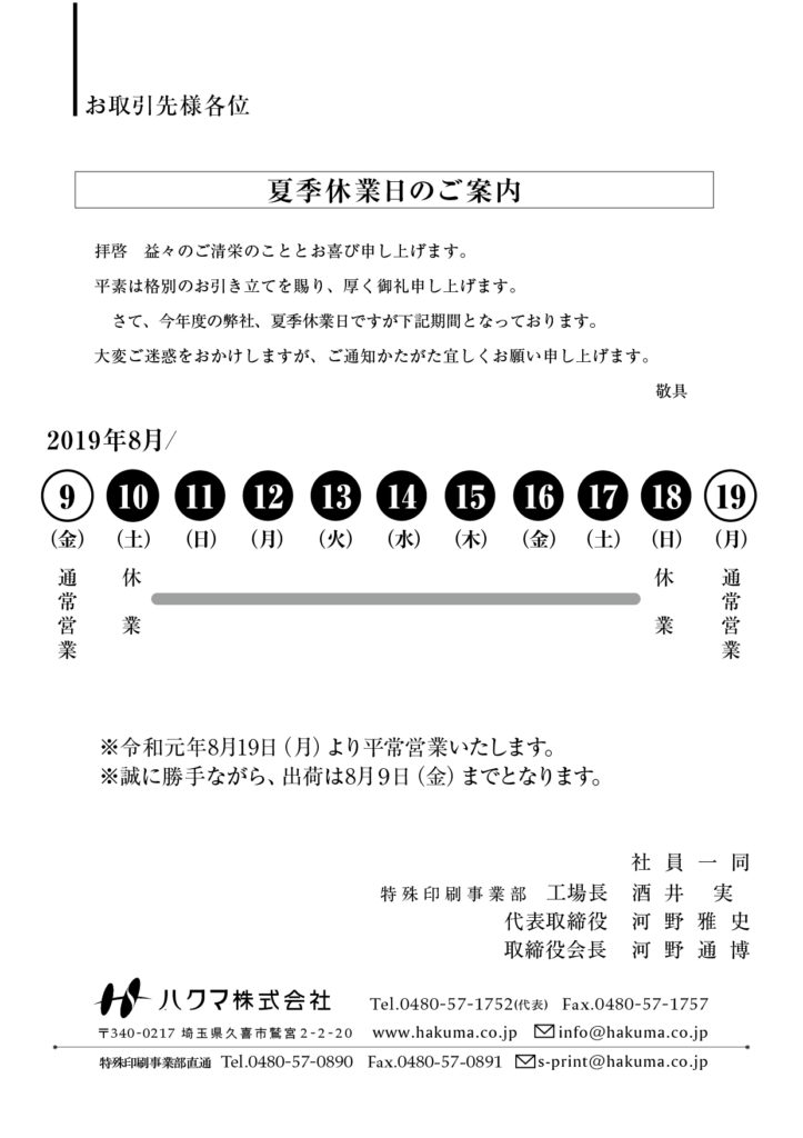令和元年8月10日(土)~令和元年8月18日(日) 令和元年8月19日(月)より通常営業致します。